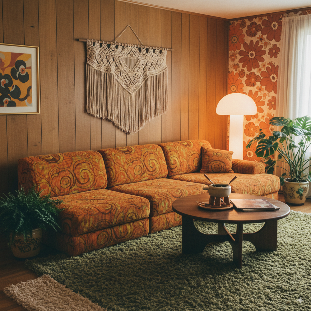 Nach Entbehrung kommt Haltung – und Farbe. Petrol, Senf, Orange; organische Linien; Nierentische als Partner. Das Sofa rückt ins Zentrum des Familienlebens, es lädt ein, beheimatet, erweitert sich zur Wohnlandschaft. Repräsentation weicht der Lust am Wohnen.